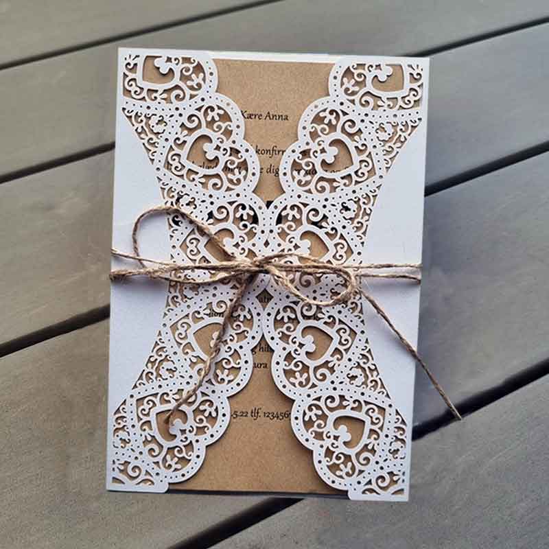 Er du mest til det rustikke, men gerne lidt romantiske, så er dette kort absolut et godt bud. Kortet er hvidt med flot mønster. Her er det vist med et indstik i kvistpapir (brunt) og et sejlgarn bundet omkring for at fuldende det rustikke look.